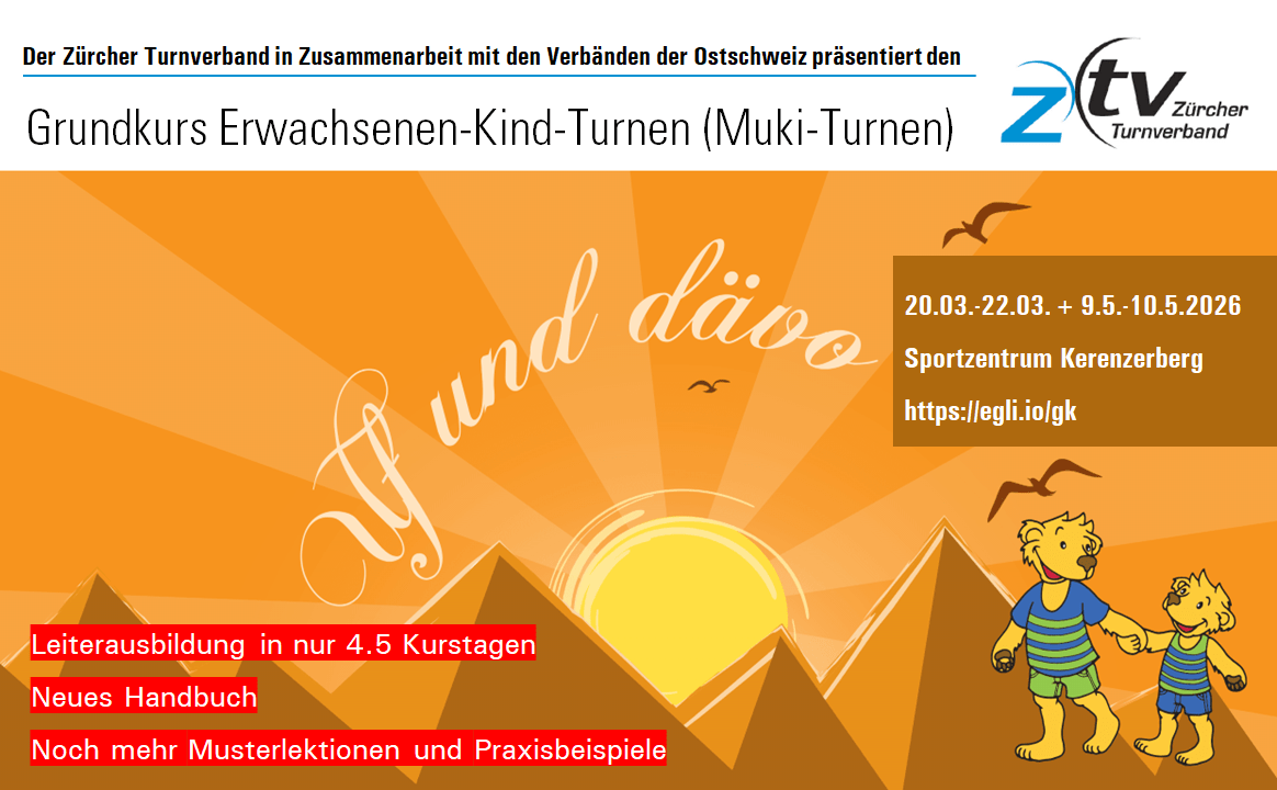 Ausbildung zur Stufe Leiter 1 Erwachsenen-Kind-Turnen, Muki-Turnen oder Elki-Turnen. Vielseitige Theorie- und Praxis-Ausbildung gemäss dem offiziellen Lehrgang des Schweizerischen Turnverbands (STV)